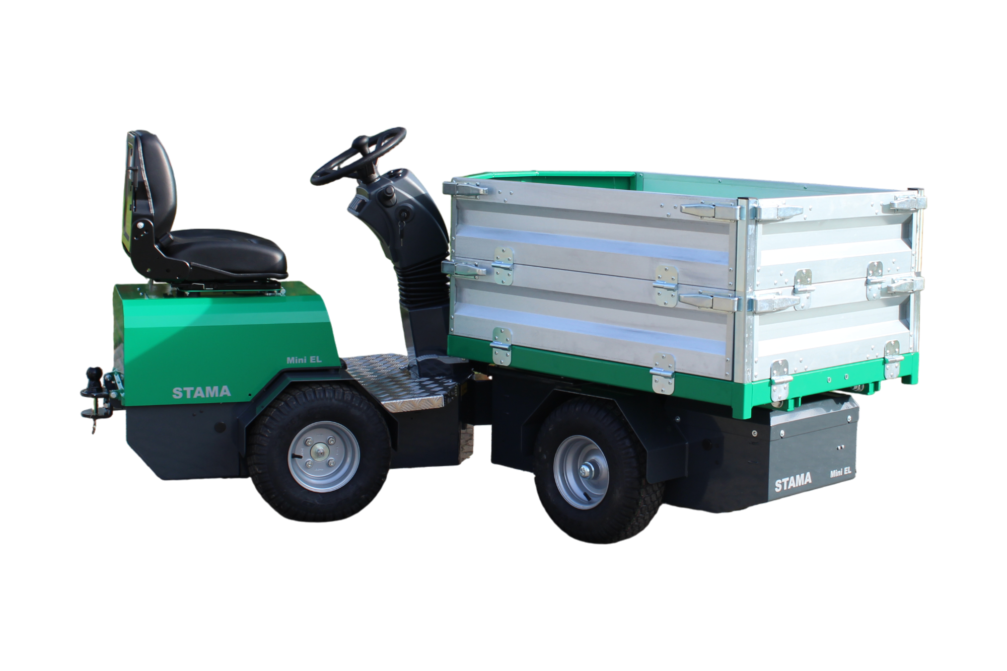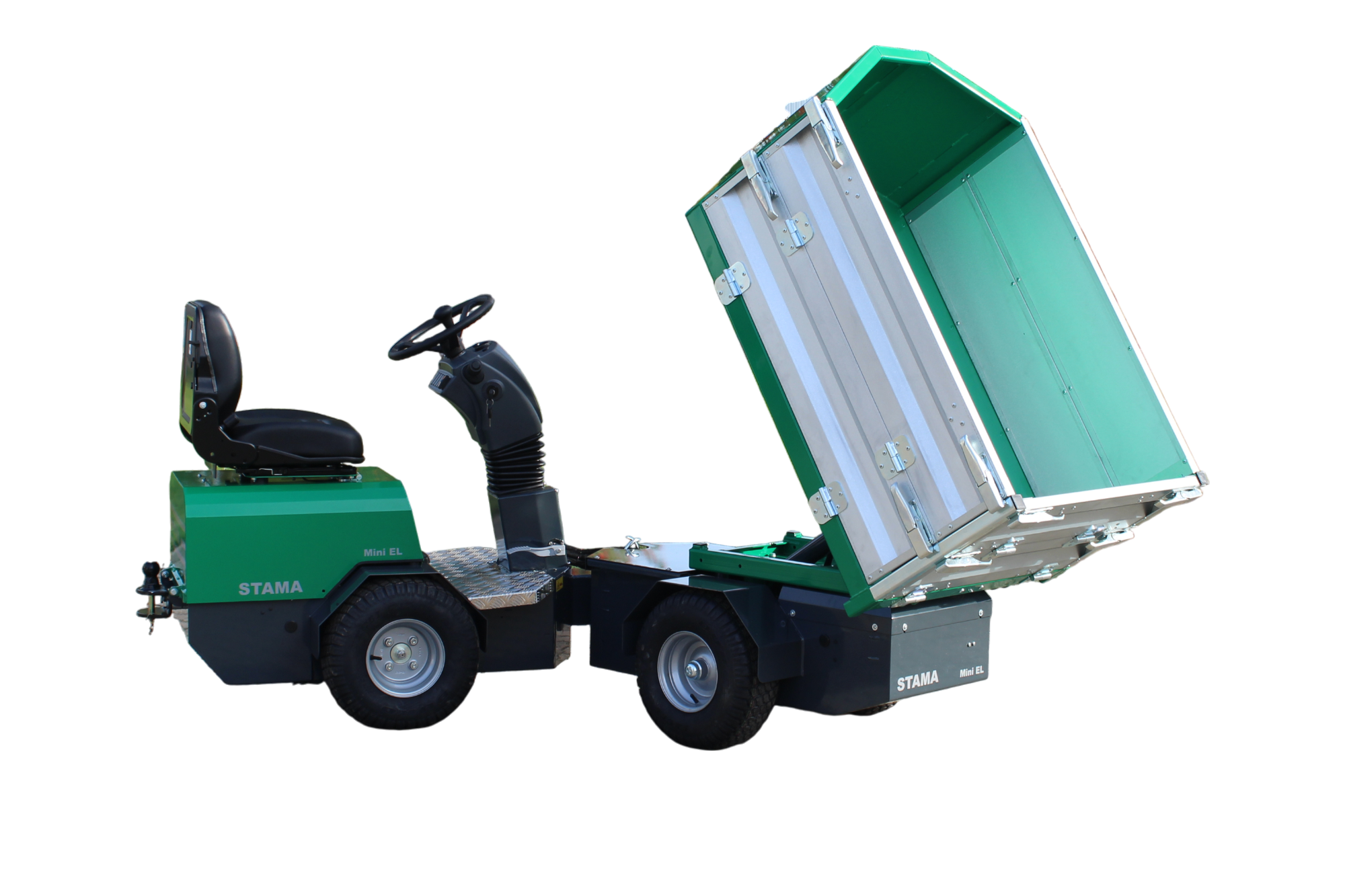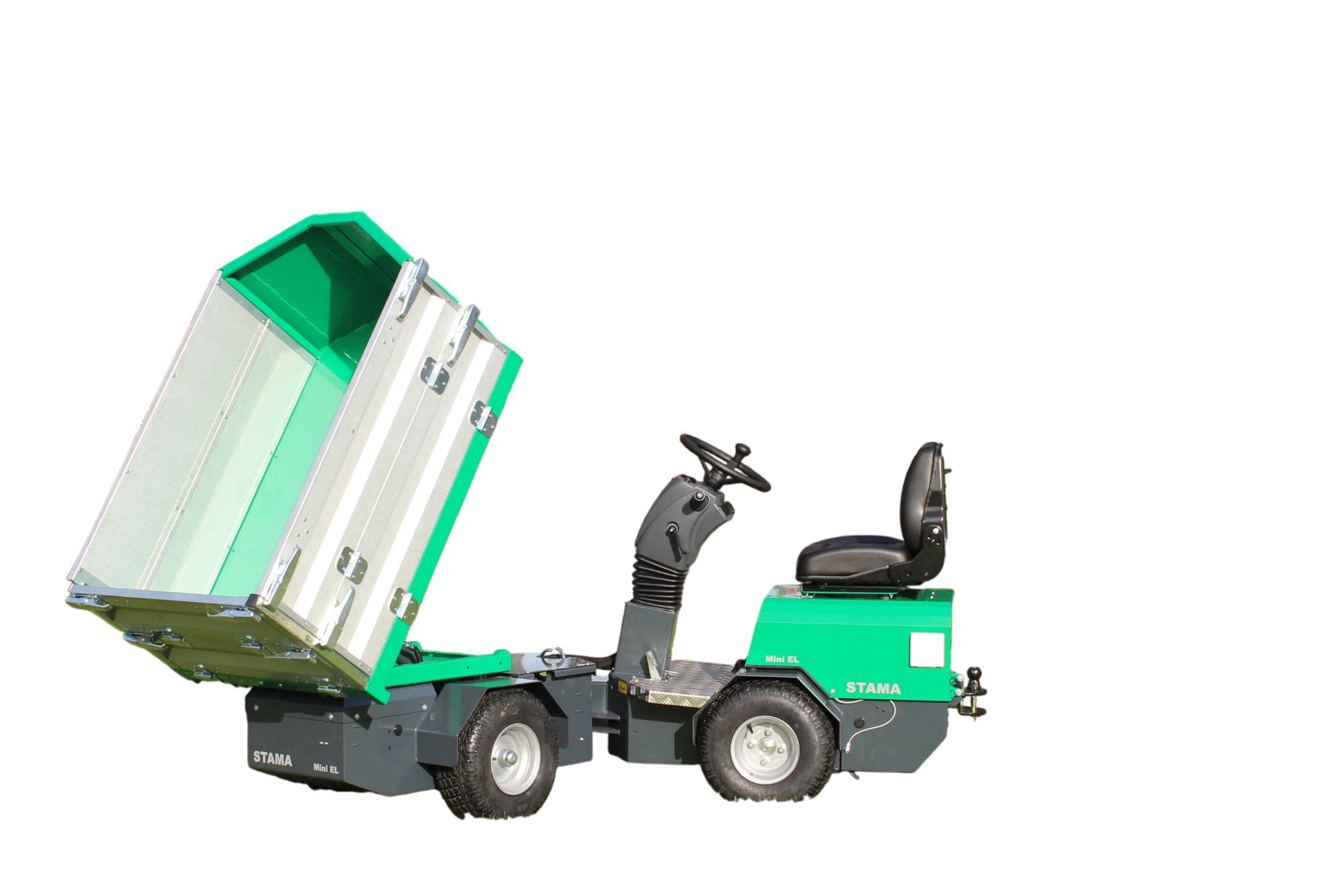 STAMA Mini Basic EL leveres med hydraulisk tip-lad (900 x 1400 mm) og kan fås med manuelt drejelad, så der kan tippes i op til 180°. Den lave indstigning, servostyring og 2-trins gear sikrer høj kørekomfort og maksimal sikkerhed under arbejdet.