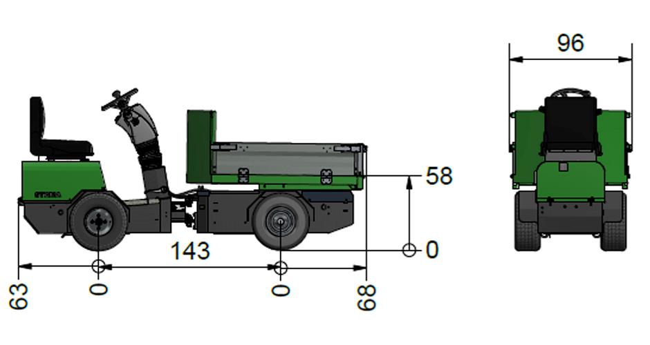 Køretøjet er udstyret med en støjsvag 24V 1,7 kW AC elmotor og kan leveres med enten vedligeholdelsesfrie gelbatterier (180 Ah) eller lithiumbatterier (180 Ah) – begge med intern lader. Det giver lang driftstid og minimal vedligeholdelse i hverdagen.