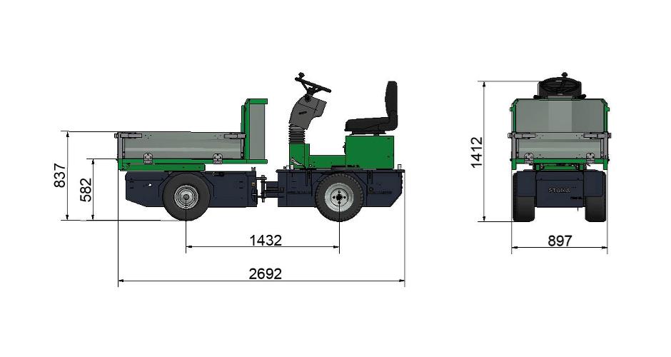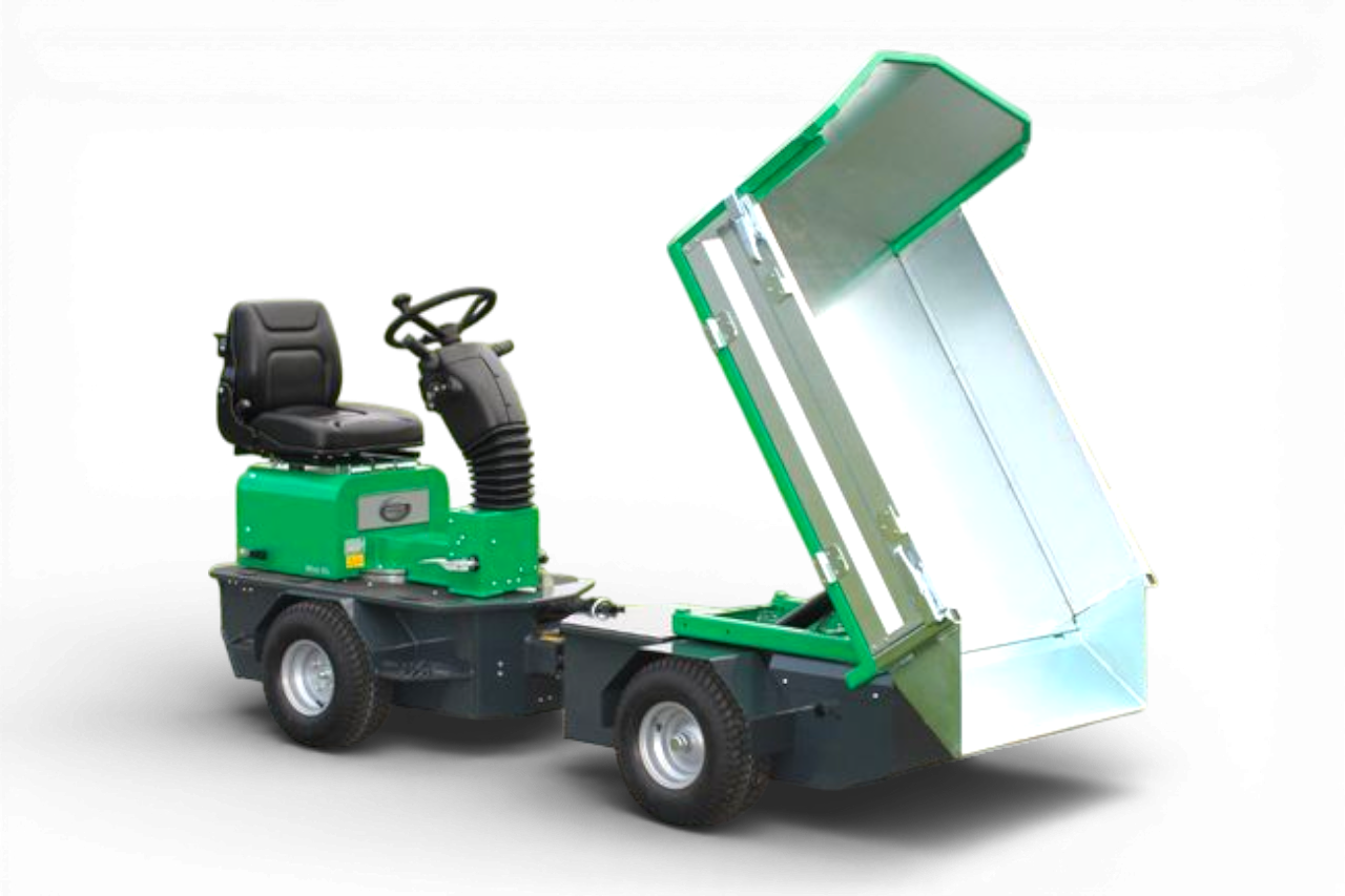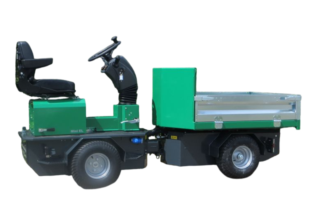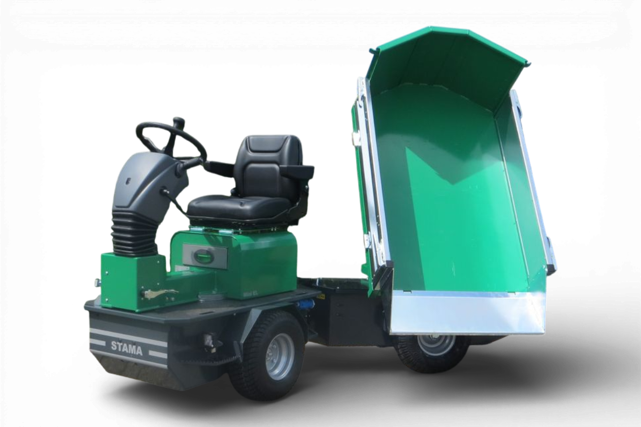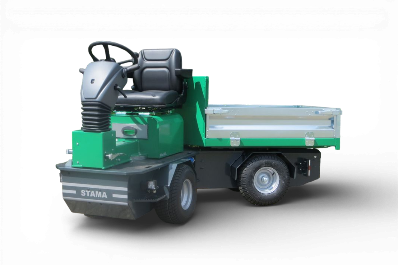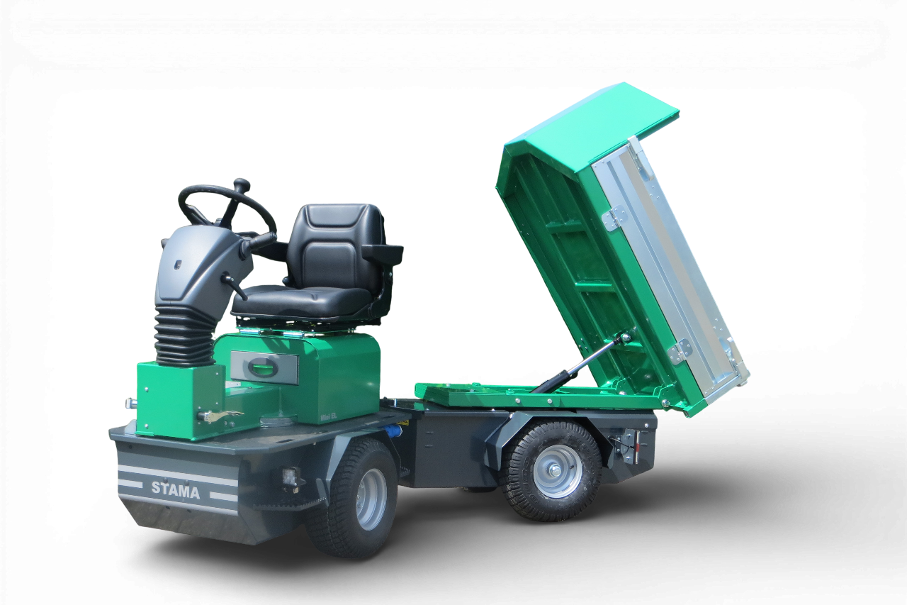 STAMA Mini RS EL leveres med hydraulisk tip-lad (900 x 1400 mm) og kan udstyres med manuelt drejelad, så der kan tippes præcist dér, hvor det ønskes. Med 2-trins gear, servostyring, indstilleligt rat og førersæde samt let af- og påstigning er køretøjet komfortabelt og sikkert at betjene hele arbejdsdagen.