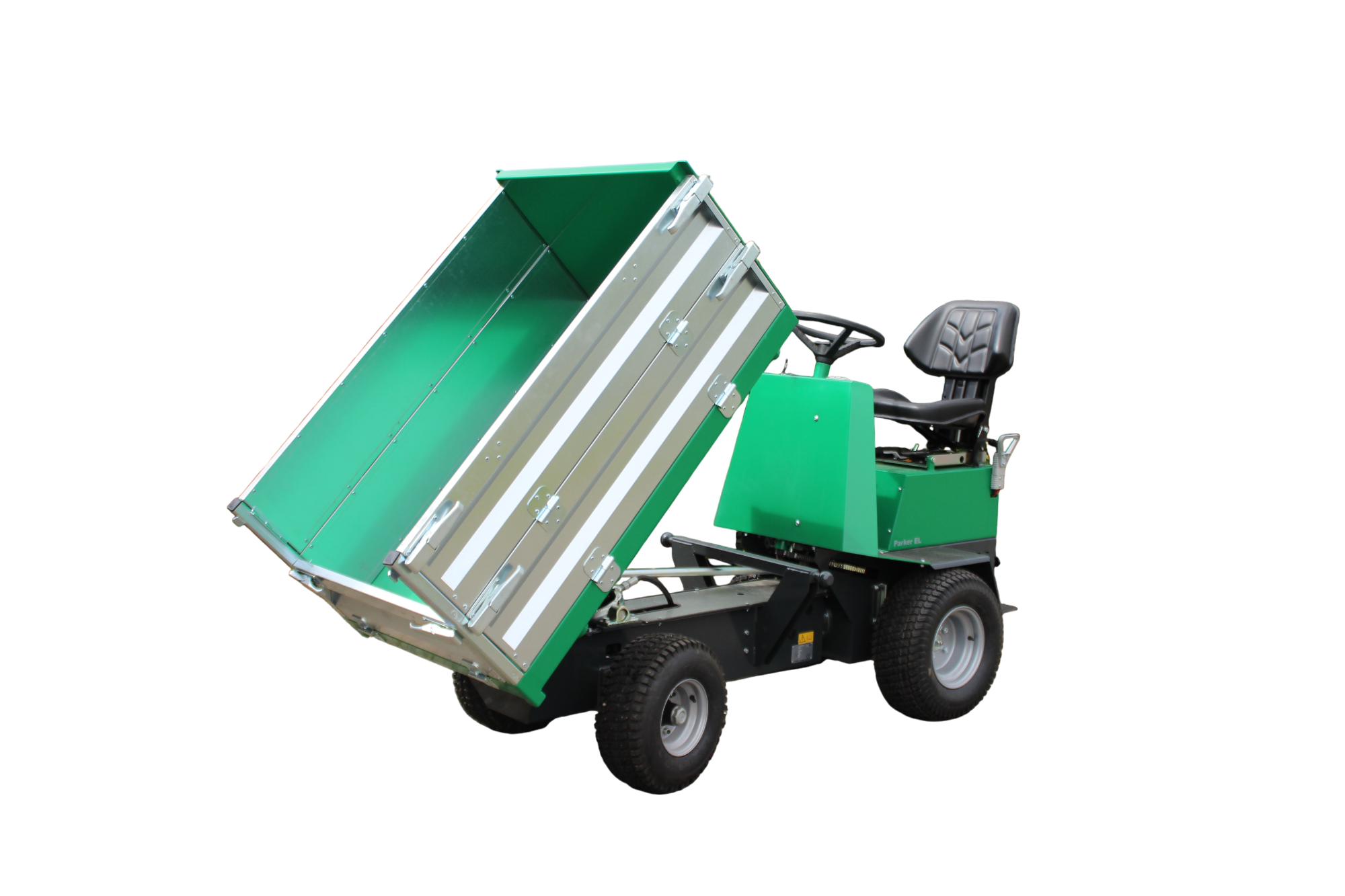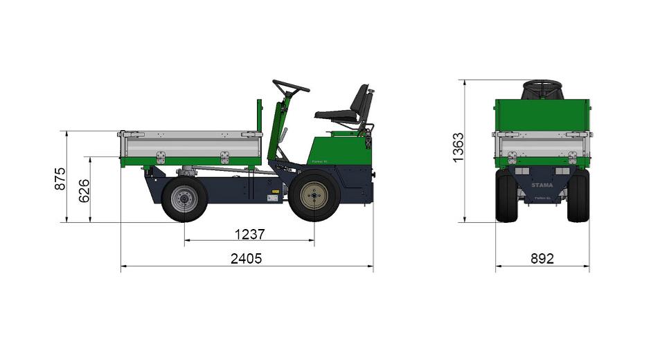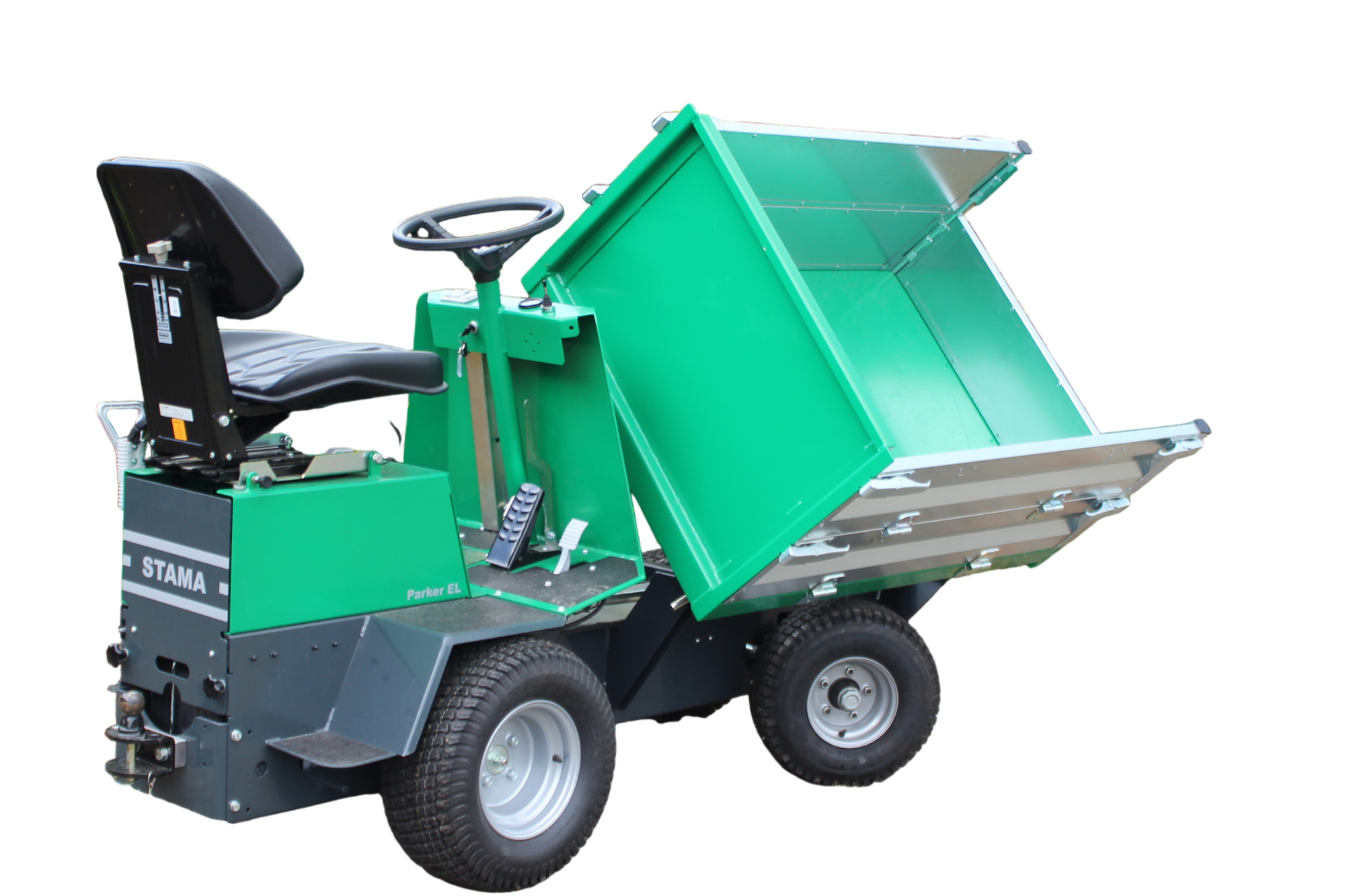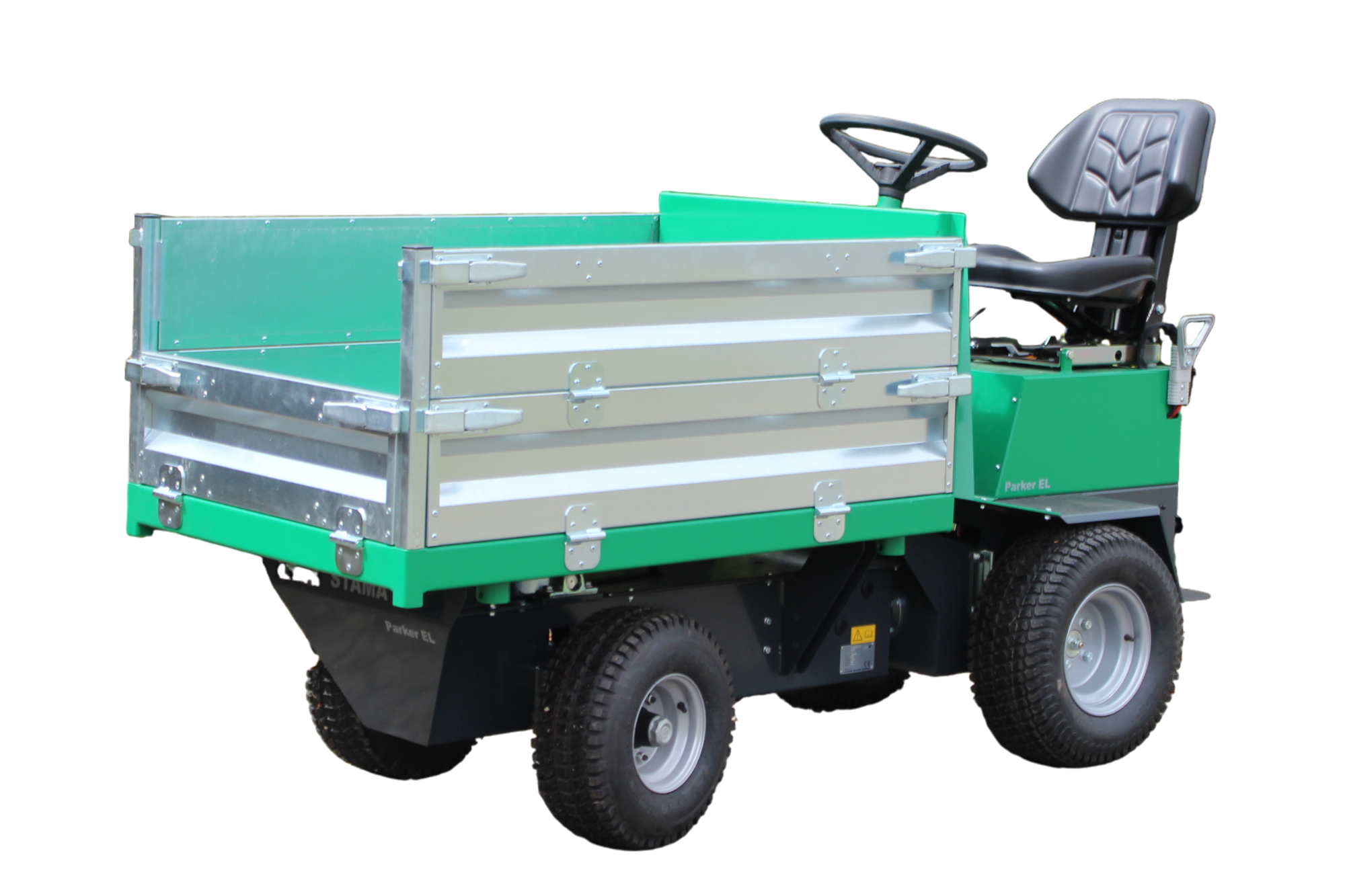 Stama Parker EL leveres med hydraulisk 3-vejs tip (900 x 1400 mm) og lav læssehøjde, hvilket gør af- og pålæsning nem og fleksibel. Med 2-trins gear, lille venderadius og let af- og påstigning er køretøjet både brugervenligt og manøvredygtigt – selv på trange områder.